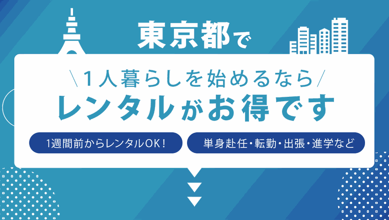 学生さんや単身赴任、出張などで、一人暮らしを始めるためには、家具・家電を一式そろえないといけないですね。テレビ、洗濯機、冷蔵庫、電子レンジ、ベッド・・・など、すべてを購入すると、かなりな出費になります。